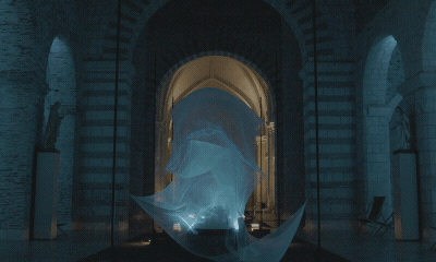 The idea is to extend and modernize his research, using digital tools to augment the silk drape, which will be seen as a screen. Written for the dimensions of the Collégiale’s interior space, the Murmures installation consists of 5 similar modules placed on either side of the transept in the main aisle. It offers a general viewpoint at either end, but also allows visitors to wander between and around the 5 modules.