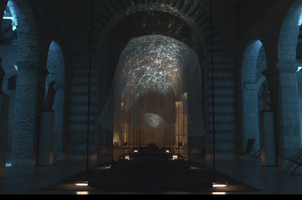 The idea is to extend and modernize his research, using digital tools to augment the silk drape, which will be seen as a screen. Written for the dimensions of the Collégiale’s interior space, the Murmures installation consists of 5 similar modules placed on either side of the transept in the main aisle. It offers a general viewpoint at either end, but also allows visitors to wander between and around the 5 modules.