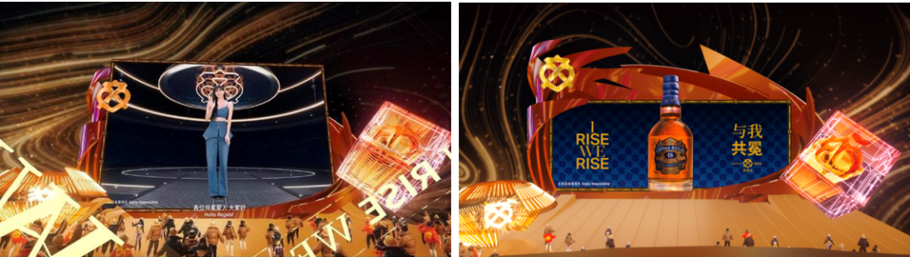 In Dec, 2022, Chivas partnered with Lisa, from Blackpink, to launch a virtual interactive space. Related Douyin topics got 67.23 million views. Through interactive games, players can unlock the ”Up Lobby”; (Rise Up Lobby); LISA’s image is presented on a virtual 3D screen on the ”Regal Stage” and participants can interact with LISA.